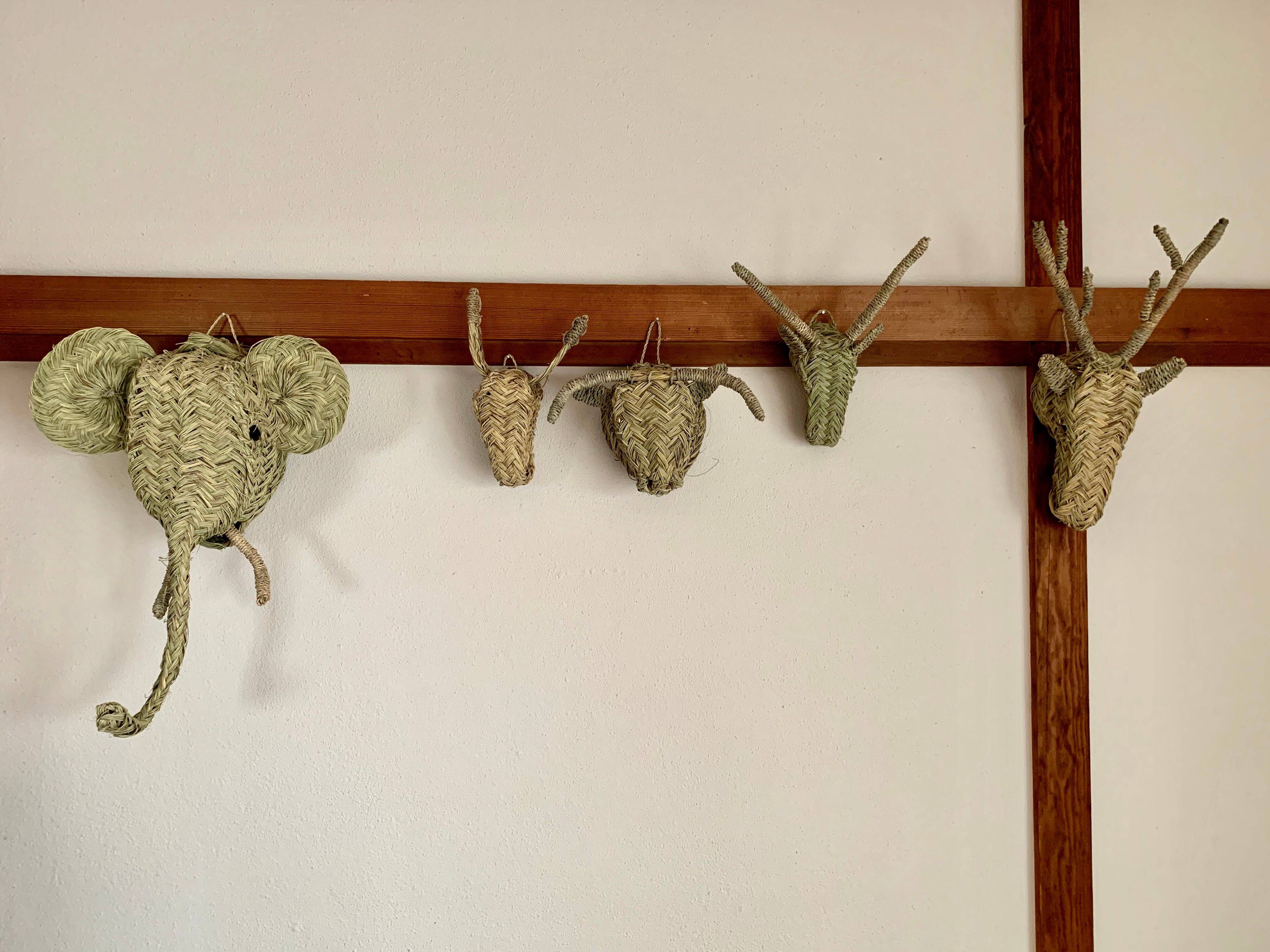 アニマルヘッドというと剥製やそれを模した木彫りの本格的なものか、テキスタイルやぬいぐるみタイプのポップなもののイメージが強く、植物で編みあげたものは見たことがありません。