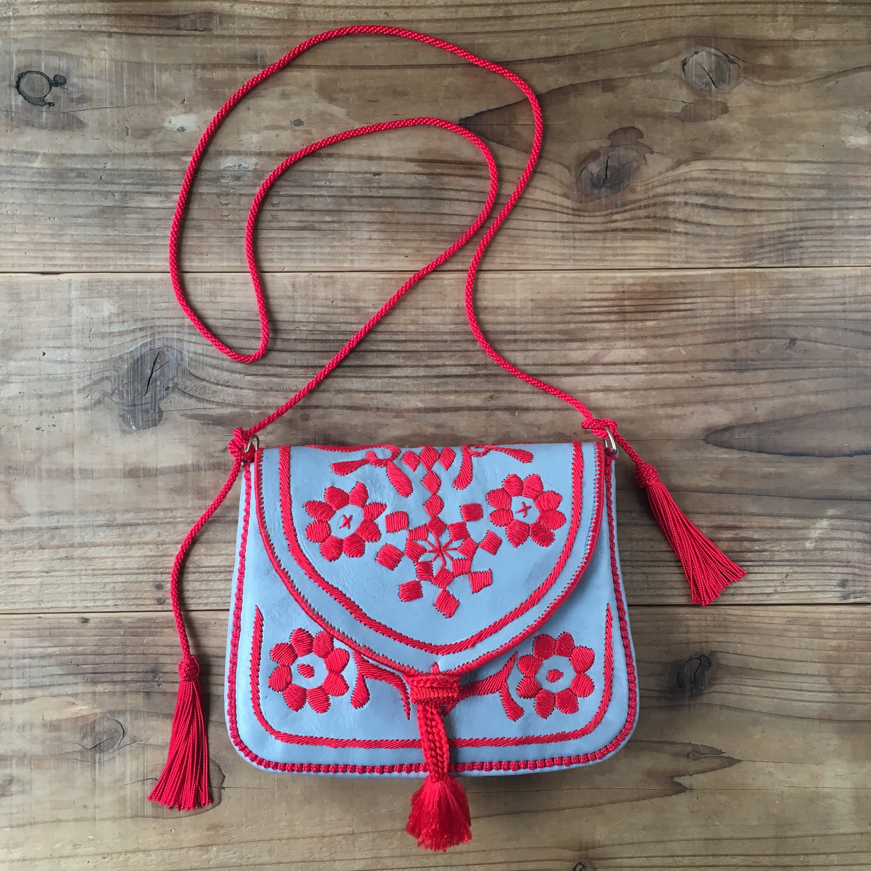 ベルベル民族の刺繍が施された、美しい山羊革のバッグ。